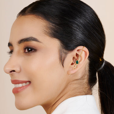 Make a statement with this sterling silver ear cuff, plated in 18k Gold/Rhodium. Featuring a bold zigzag design with a vibrant oval-cut Green Onyx and delicate CZ accents, it’s finished with a sleek pointed tip for a modern, edgy look. Lightweight and stylish, perfect for solo wear or stacking.
