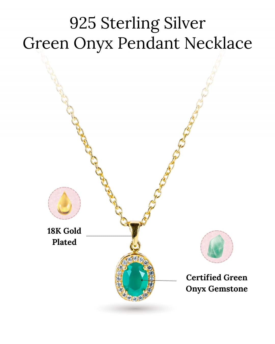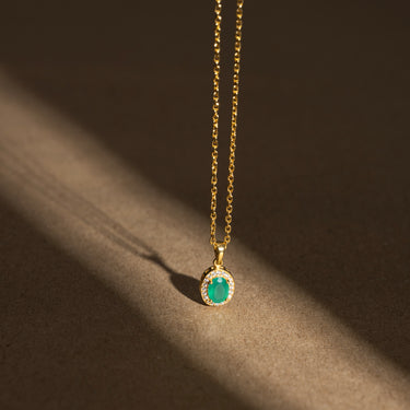 Elevate your look with this Green Onyx birthstone pendant necklace. The deep green oval Green Onyx takes center stage, elegantly set in a classic prong design that enhances its natural brilliance. Encircled by a halo of shimmering CZ stones, this pendant radiates a subtle sparkle with every movement. Whether worn alone or layered with your favorite pieces, this necklace effortlessly blends timeless sophistication with modern allure, making it the perfect accessory for any occasion.