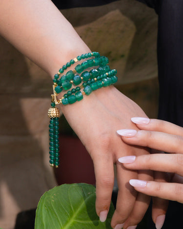A statement bracelet crafted in 925 sterling silver with 18K gold plating, featuring five strands of radiant green onyx accented with golden details and finished with a dramatic tassel. Bold yet timeless, it’s designed to shine with every look.