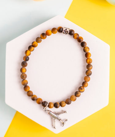 Introducing our adventurous Tiger's Eye bracelet, crafted for young explorers! Each piece features lustrous 6mm Tiger's Eye beads, known for their golden-brown hues that evoke the spirit of adventure. Adorned with an aeroplane charm and our signature logo bead, both expertly made from sterling silver with rhodium plating for a sleek and polished look. Strung on a durable stretch cord, this bracelet provides a comfortable fit for little wrists, blending excitement, tradition, and a touch of aviation charm. An ideal accessory to inspire dreams and capture the special bond between siblings!