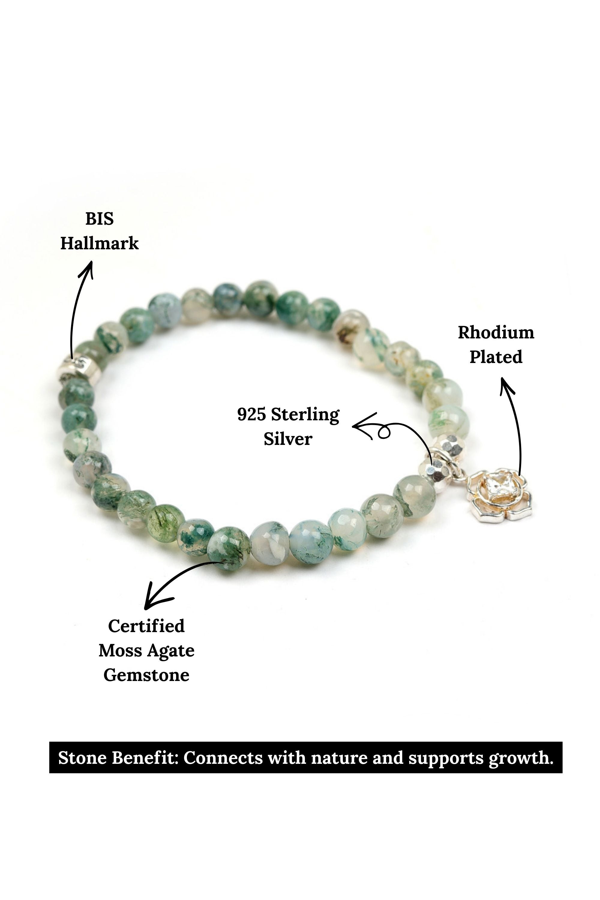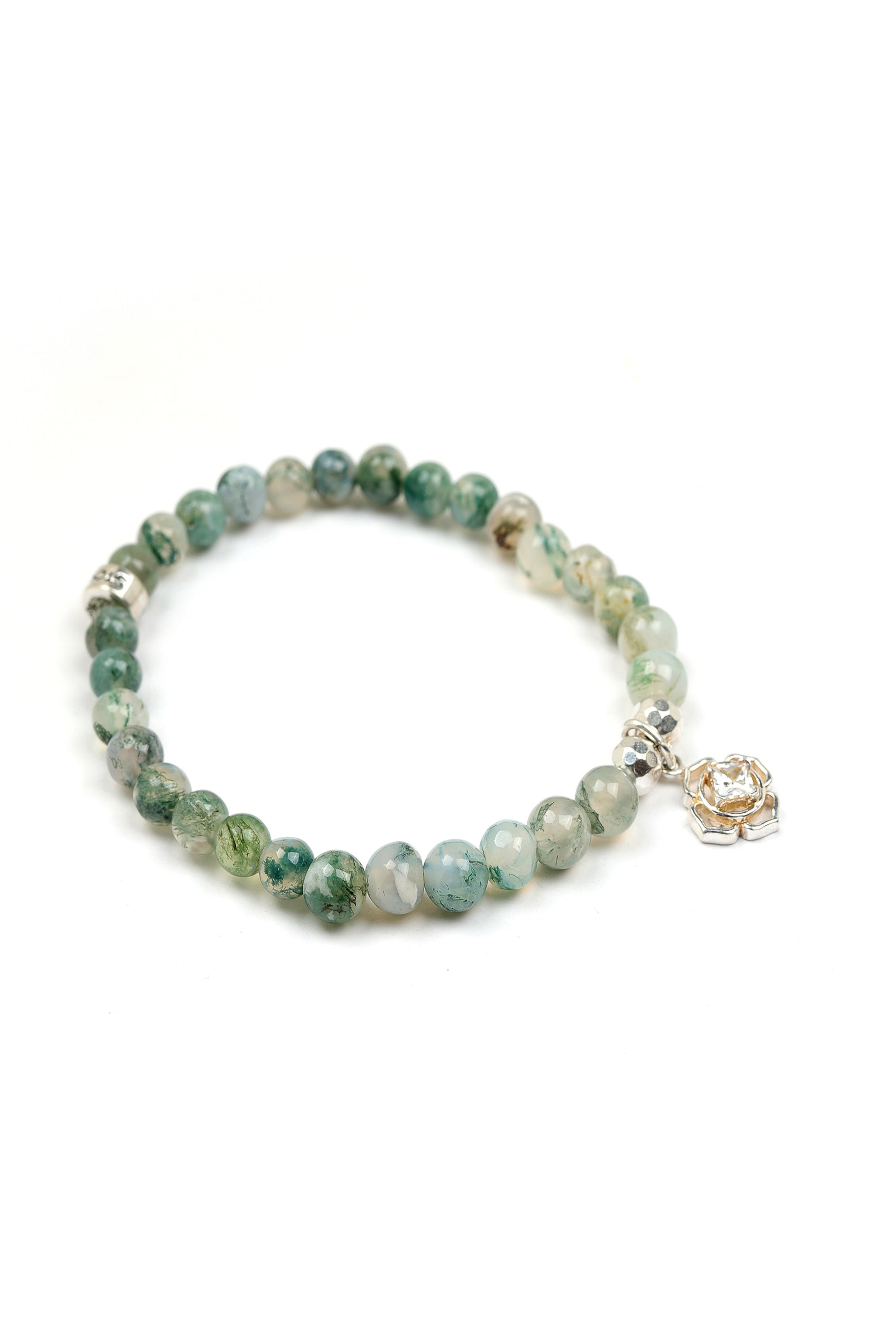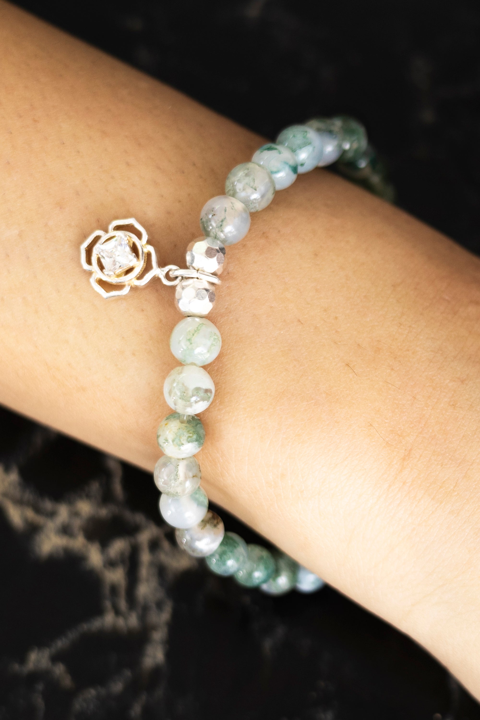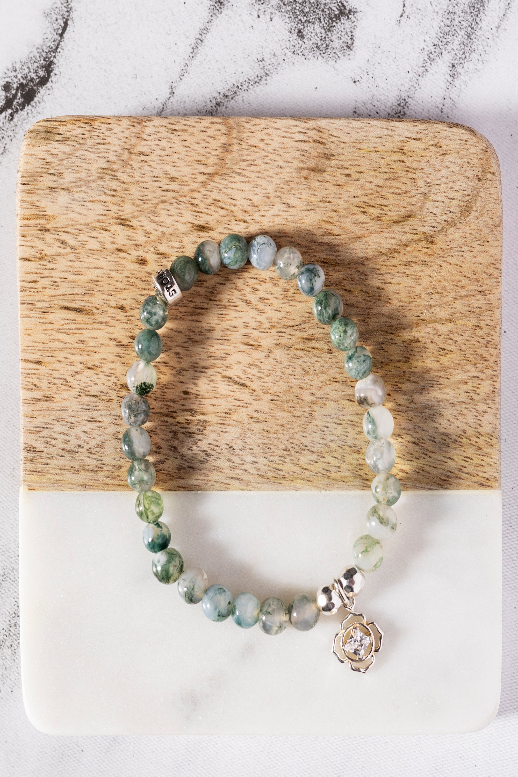 This bracelet features Moss Agate gemstones, a floral charm with a sparkling center, and our signature logo bead, all crafted in 925 Sterling Silver. It seamlessly blends sophistication with everyday wear. Strung on a durable stretch cord, this bracelet is perfect for stacking or wearing solo as a timeless accessory.