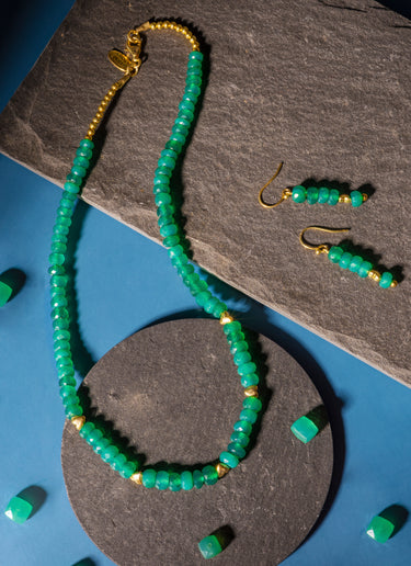 This soothing Green onyx stone has been used with heart charm to provide a positive feeling to the wearer. It brings good fortune and encourages happiness. The heart charm is added as heart as it is considered to be the seat of our soul. Strength, Courage and Bravery all comes from our heart. This handcrafted piece is 14 inches long and sits beautifully around our neck, made of rondelle Green onyx beads of 4/5mm size, it is strung with gold heart accents in regular intervals and finished with gold beads and lobster clasps lock to adorn you. It comes with the matching dangling earrings, their gold accents are sterling silver with 0.25 Micron 18K gold plated, which can be bought seprate or as a set.