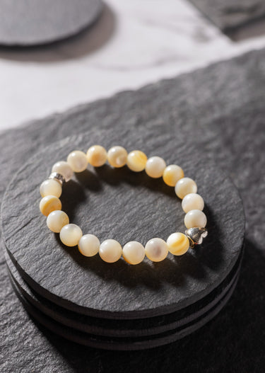 A symbol of wisdom and tranquility, this Mother of Pearl bracelet features a luminous, iridescent glow, accented with heart charm and our signature logo bead, all crafted in 925 Sterling Silver and rhodium plated for lasting shine. Perfect for stacking or solo, ideal for everyday wear or a meaningful gift.
