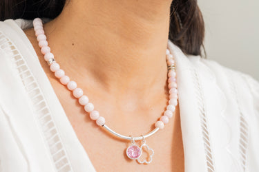 This pretty piece is all pink. Its soft and loving energy will comfort and soothe the wearer. Shine on with our pink CZ drop which hangs in the piece along with our shiny CZ flower charm on this 22 inch neckline. Strung with 7mm Pink Opal stone beads and silver accents in regular intervals, It is finished with our stone story lobster clasps lock, All metals are sterling silver with rhodium plating.