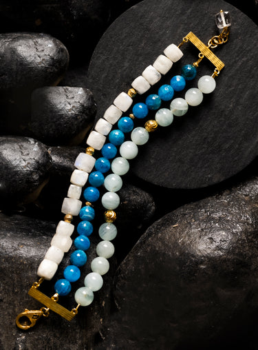 Introducing the Aqua Illumination Bracelet — a serene blend of Rainbow Moonstone, Blue Apatite, and Aquamarine, designed to reflect calm energy and effortless elegance. Crafted in 925 sterling silver and plated with 18K gold, the three gemstone strands meet at sleek metal bars and are finished with our signature logo clasp. Luminous, refined, and made to brighten your everyday style.