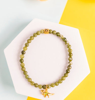 Discover our delightful collection of kids' bracelets with a playful dinosaur twist! Crafted with 4mm moss agate stones, each piece features a charming dinosaur and our signature logo bead, both beautifully made from sterling silver and plated with 18k gold for a touch of sparkle. Strung on a magic stretch cord, these bracelets are designed to comfortably fit little wrists, combining fun, tradition, and a unique sense of style. The perfect accessory for sparking joy and celebrating special moments with your little one!