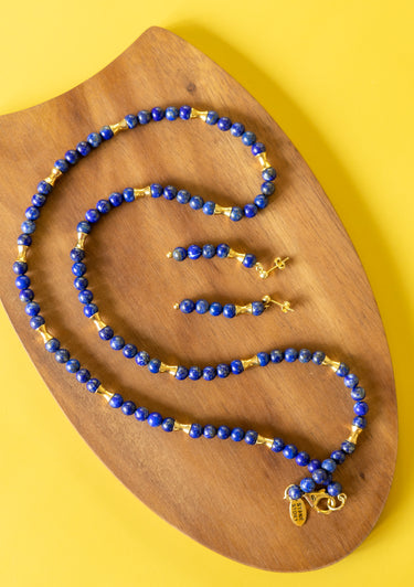 This eye catching neckpiece is made of Lapis Lazuli, a stone which is perfect for everything self, Self-expression, Self-awarness and Self-acceptance. Adorn yourself with this and unlock an inward journey with yourself. This 18 inch long necklace is handcrafted to perfection with 6mm stones and gold hourglass metal charm, A reminder to useour time wisely, strung in regular intervals. It comes with the matching dangling earrings, their gold accents are sterling silver with 0.25 Micron 18K gold plated, which can be bought seprate or as a set.