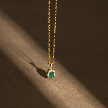 Elevate your look with this Emerald birthstone pendant necklace. The lush green oval Emerald takes center stage, elegantly set in a classic prong design that enhances its natural brilliance. Encircled by a halo of shimmering CZ stones, this pendant radiates a subtle sparkle with every movement. Whether worn alone or layered with your favorite pieces, this necklace effortlessly blends timeless sophistication with modern allure, making it the perfect accessory for any occasion.