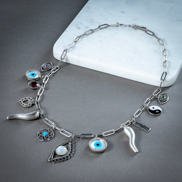 This striking necklace is a blend of modern design and timeless symbolism, crafted in sterling silver and coated with rhodium plating for a sleek, tarnish-resistant finish. Adorned with an array of thoughtfully designed charms, including the Evil Eye for protection, the Yin-Yang for balance, and a variety of abstract and intricate motifs, this piece is as meaningful as it is stylish. The bold paperclip chain adds a contemporary edge, making it perfect for layering or wearing as a statement on its own.