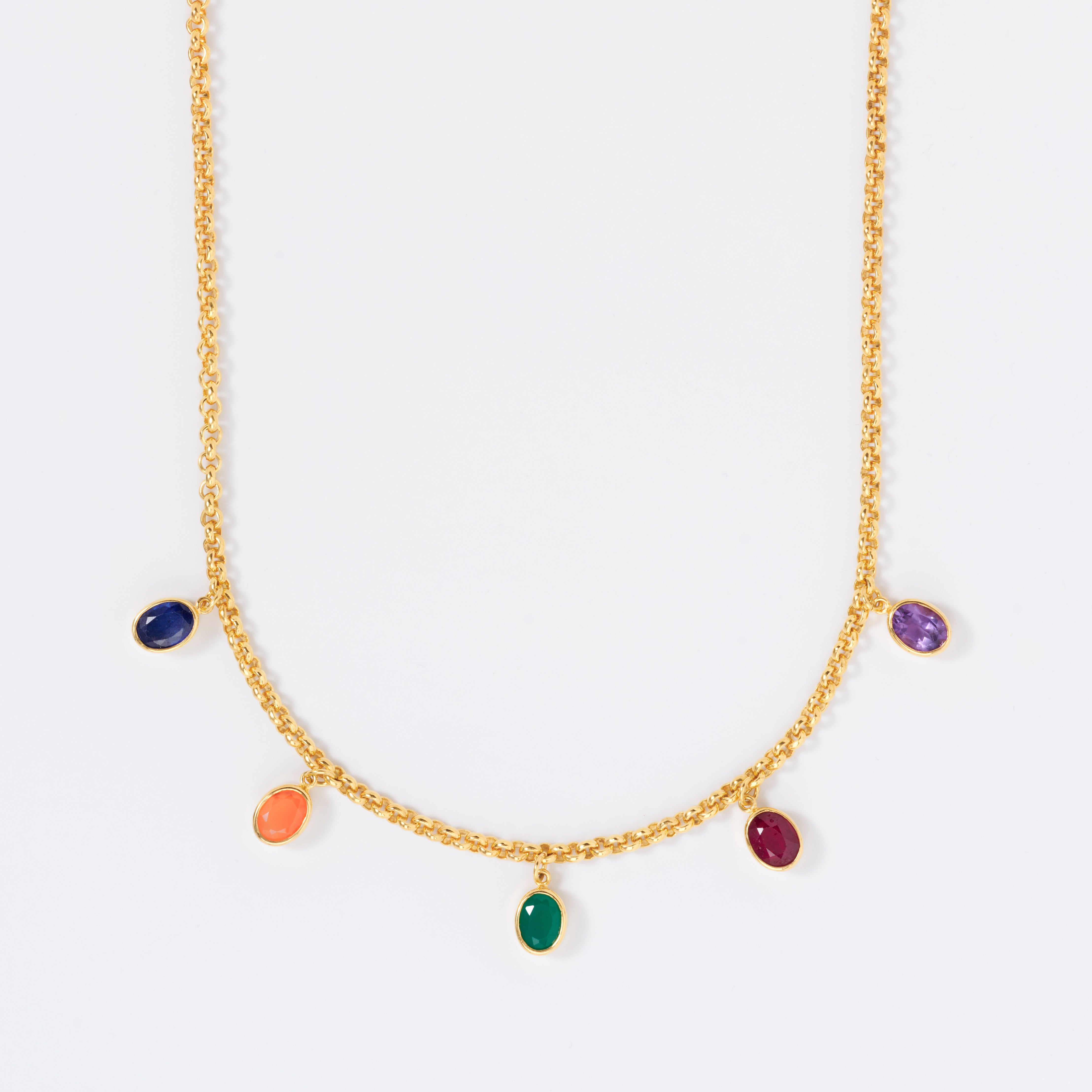 A celebration of colour, balance, and brilliance ,this necklace features five natural gemstones, each carrying its own energy, strung together in harmony on a delicate 18k gold-plated 925 sterling silver chain. Inspired by the ancient concept of Panch Ratna (five gems), it brings together the vibrance of amethyst, ruby, green onyx, carnelian, and blue sapphire to create a piece that feels both timeless and contemporary.