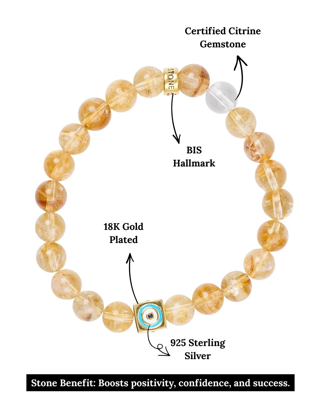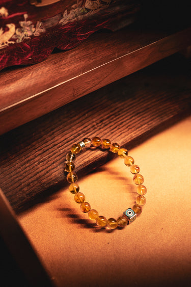 This bracelet features Citrine gemstones, an engraved Evil Eye charm at the center, symbolizing protection and good fortune, and our signature logo bead, all crafted in 925 Sterling Silver. Strung on a durable stretch cord, this bracelet seamlessly blends sophistication with everyday wear, making it perfect for stacking or wearing solo as a timeless accessory.