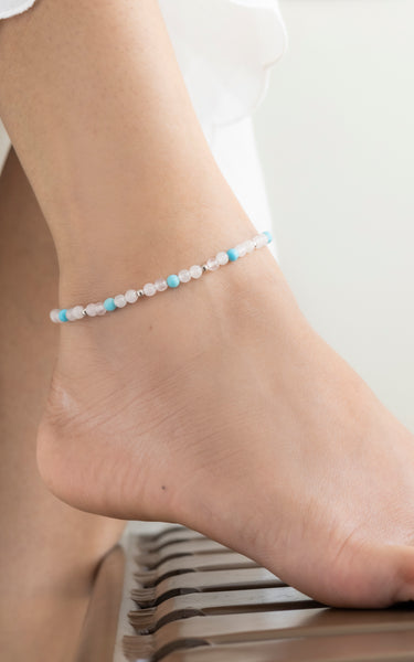 Crafted with 925 sterling silver as the base, this anklet combines the soft, soothing energy of rose quartz with the vibrant freshness of turquoise. Accented with rhodium-plated silver spacers, it's a delicate balance of calm and clarity—perfect for everyday wear with an easy sense of style.