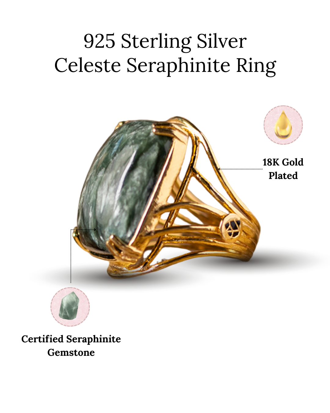 Crafted in 925 sterling silver with a refined prong setting, this ring features a striking Seraphinite rectangle cabochon, known for its feathery green patterns and natural depth. Available in Rhodium and 18K gold plating, it combines modern sophistication with timeless allure.